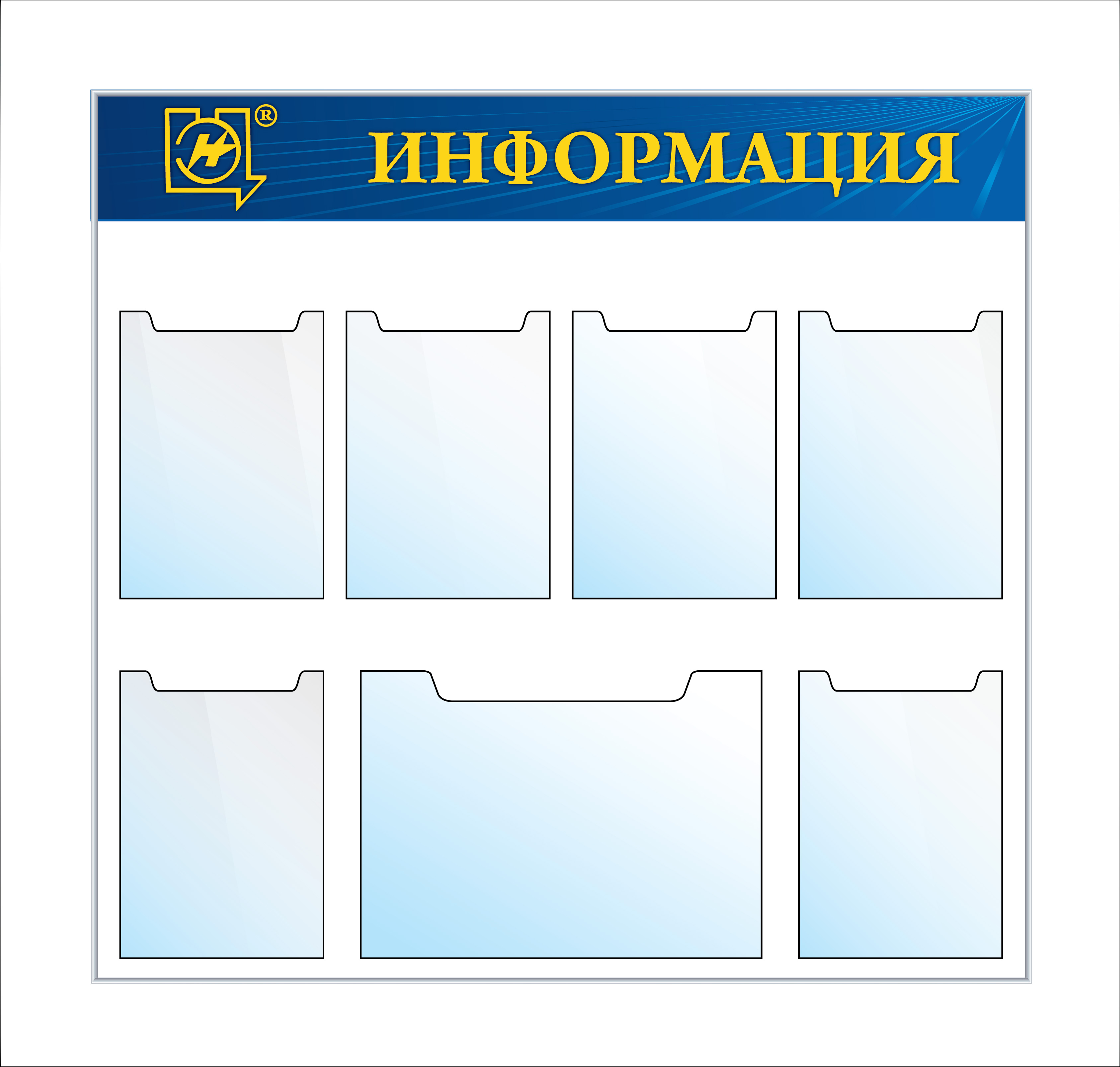 Стенд Информация Наполнение: 8 карманов А4 (плоские) (1000х1000; Пластик ПВХ 4 мм, пластиковый профиль; Пластиковый синий)