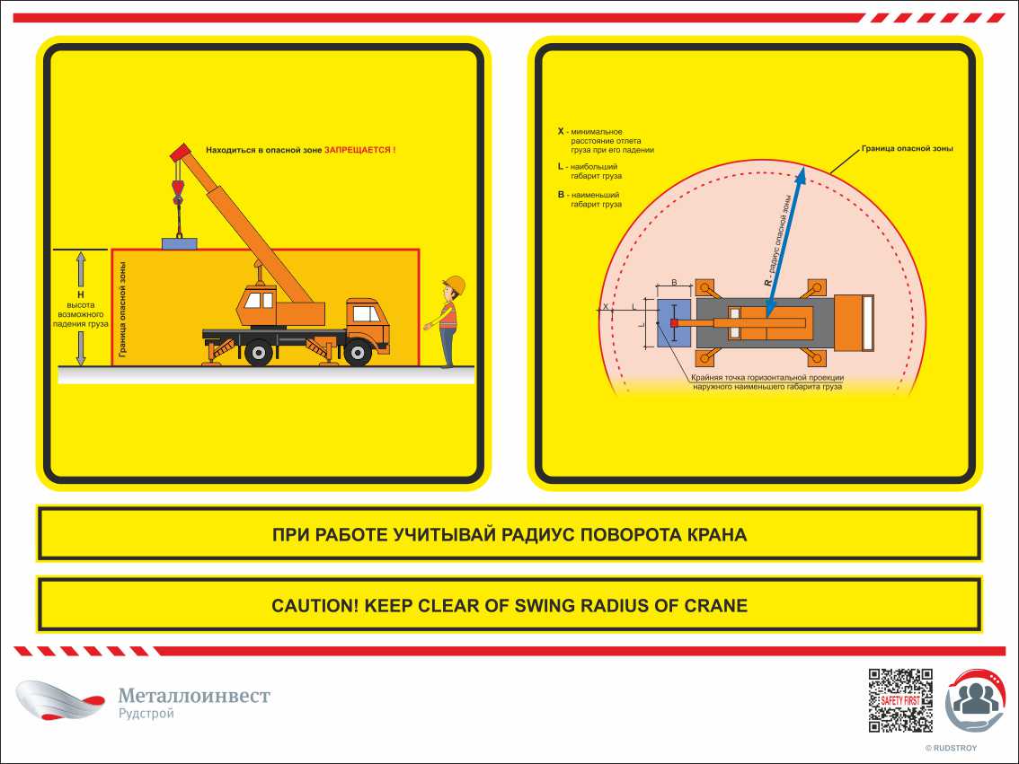 Мультиязычный знак безопасности - При работе учитывай радиус поворота крана
